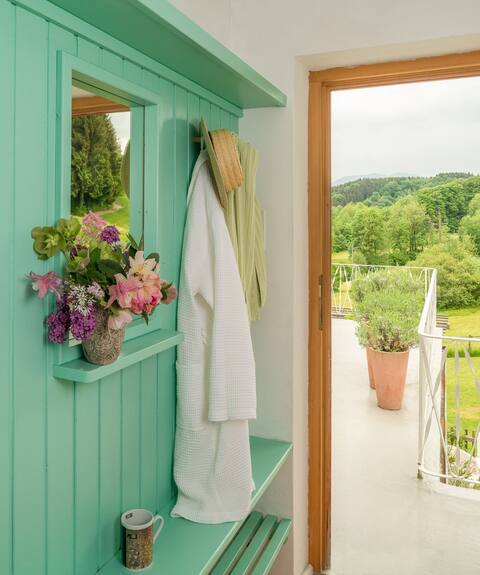 Drei individuelle Ferienwohnungen für jeweils zwei Personen – „Müßiggang“, „Blaumachen“ und „Nichtstun“ – erwarten dich im ersten Stock, jeweils mit Balkon oder Terrasse, Blick auf See und Berge und mit der Einladung zum Verweilen in unserem großen bunten Garten.